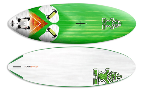 “A pioneering slim freeride board … a new volume distribution with more dome in the tail, offering more grip and comfort. The outlines of these boards have a more efficient planing surface, being wider in the front and narrower towards the tail. So the Atom iQ’s wide shape and low centre of gravity gives you the stability and power in light winds and control and manoeuvrability in strong winds. The bottom shape comes from our iSonic racing line and it gives the Atom iQs their speed and acceleration.”