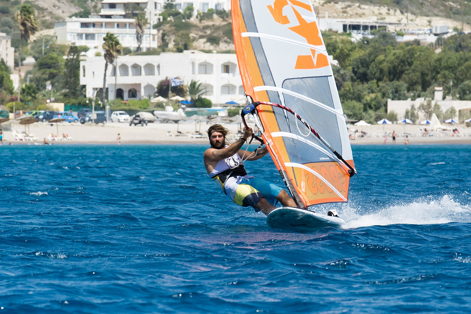 I take my 120-litre slalom board and a 7.1 & 7.7, but some people take freestyle boards, like my son Steve, who takes a 100-litre freestyle board and 5.0 and 5.6 sails. Private kit storage capacity is very limited and most people hire from the centre, because it provides far greater flexibility and the quality of the kit that they provide is excellent. In my view, if you’re a freerider, taking your own kit limits your options and you’ll regret it when everybody is changing down and you can’t. My daughter Sam always hires and typically uses a 100-litre board and a 5.3, changing down to a 4.7 as it picks up. The conditions are incredibly consistent and there’s a rescue boat on the water every day to give you the confidence to push yourself further than you might otherwise be comfortable doing. Jens’s passion for windsurfing sets the vibe at his centre. He absolutely loves this great sport and he wants you to love it too. The centre can provide everything you need, but I’d recommend that you take your own harness and maybe a summer shorty, although I usually sail in boardies and a rash vest. A tight fitting cap and a shed load of factor 30 are also a good idea! The windsurfing centre can be contacted at  info@kefaloswindsurfing.com, and you can check out the various hire packages available at www.kefaloswindsurfing.com.