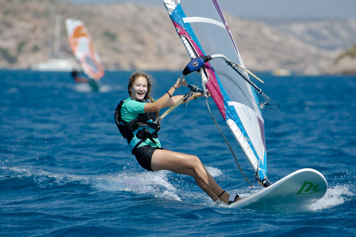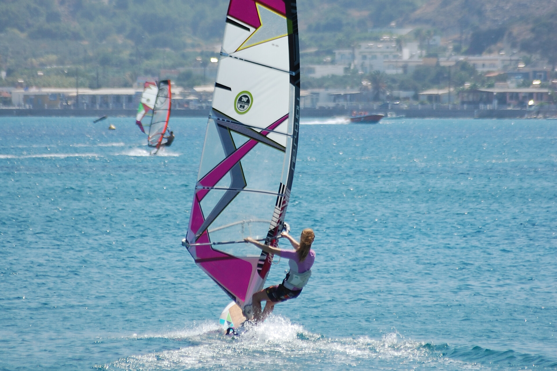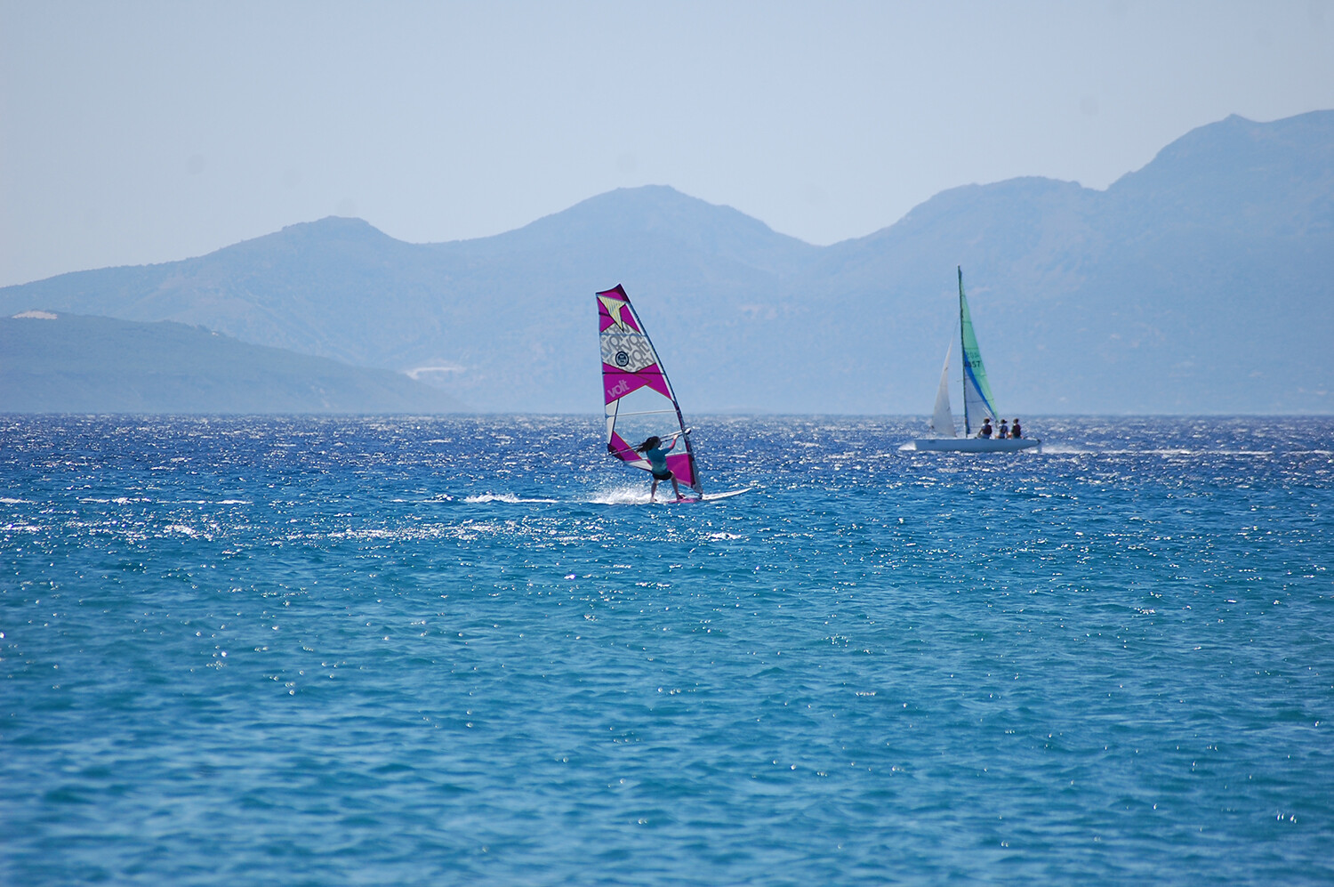 Don’t be anxious about the wind being offshore, as if you’re not confident in your ability to sail upwind, the rescue boat will happily fetch you as often as is necessary. For the slightly more experienced, when you want to head in, there’s an express way’ home! A bend in the wind, created by the mountain at the southwestern end of the bay, allows you to make the journey back to the beach in no time. Simply hug the foot of the mountain until you’ve gained enough ground upwind to bear away and head straight for the windsurfing centre