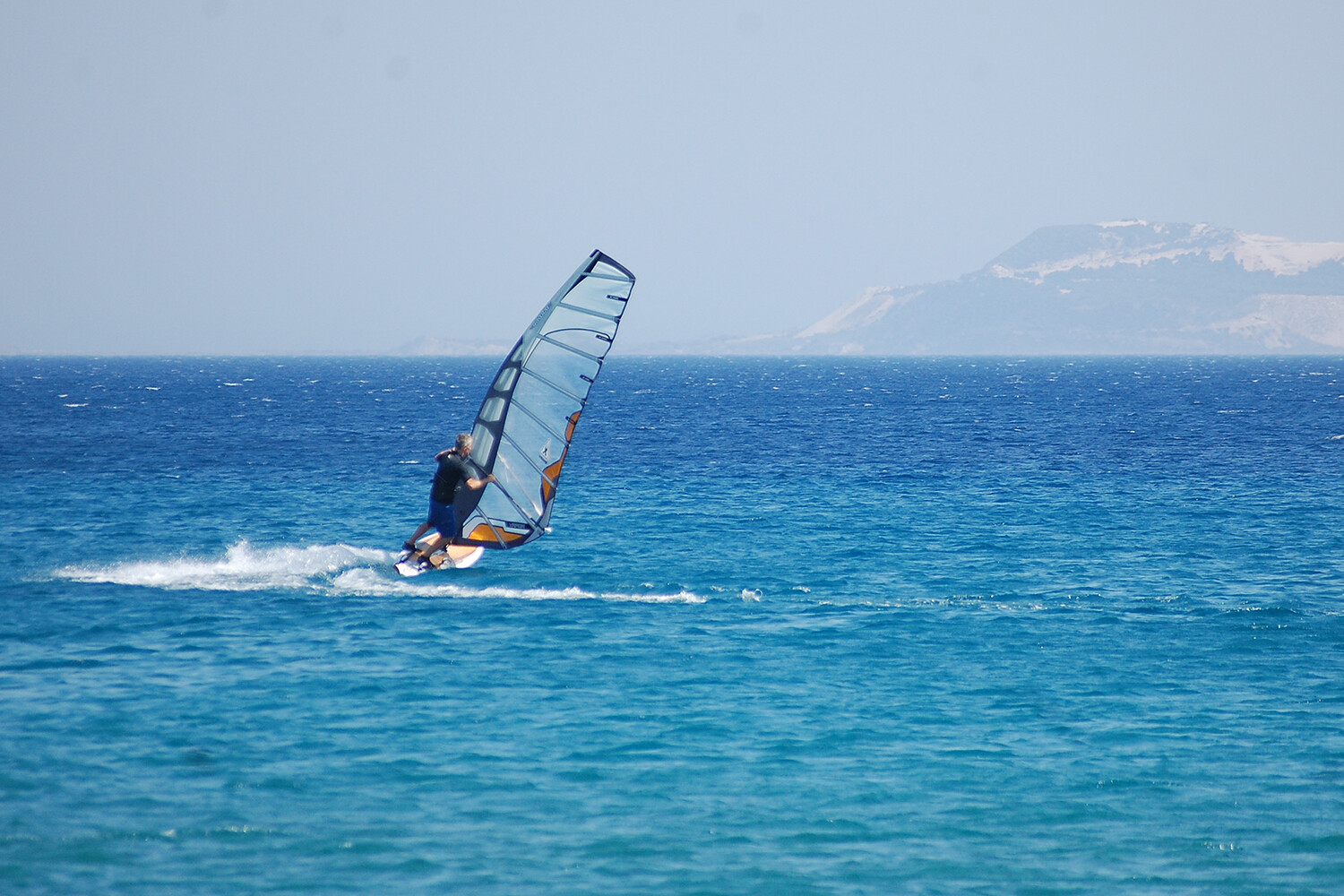 Kefalos is suitable for all levels for two reasons. Firstly, the summer wind on Kos is a northerly thermal called the Meltemi, which is gentle in the morning, but really picks up in the afternoon and as it gets squeezed between the mountains at either end of Kefalos Bay it accelerates ‘big time! The moderate to strong afternoon winds are very consistent from May through to September and Kefalos rarely fails to deliver during the summer months. June, July and August are the windiest, boasting force 4-6 winds most afternoons. It’s not unusual to score 14 out of 14 planing days in mid summer!