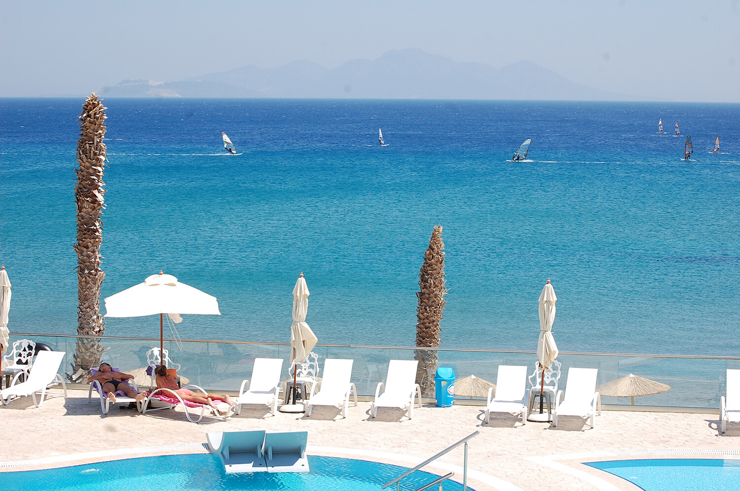 I’d been on quite a few windsurfing holidays before I discovered Kefalos, and for me it was quite literally a case of love at first sight. I was staying elsewhere on the island of Kos, but had been told by a local that as a windsurfer, Kefalos was definitely a place I should check out. So, one sunny afternoon in July, my family in tow, I drove our hire car down to the southwest coast of Kos, where the quiet village of Kefalos lies about 20 minutes (or 30-40 euros by taxi), from the airport. The road through Kefalos runs behind the front row of tavernas, apartments and hotels for much of its length, making the beach quiet and peaceful. I parked up behind the Sacallis Inn Beach Hotel, where unbeknownst to me at the time, I was destined to eat several hundred lunches over the course of the next two decades, whilst watching the action on the water from the restaurants perfectly situated veranda!
