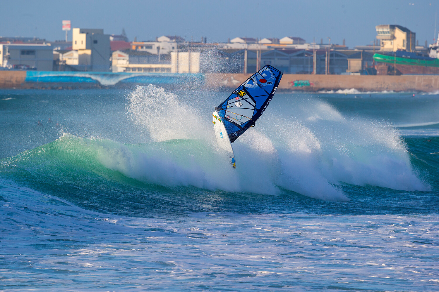 I knew the main aim was to sail Nazaré on the second day of the trip and had been so consumed with that idea that I had barely paid attention to the first day’s plan. A mention of a wave near Lisbon and a boat was about it, the rest we were leaving to Jamie’s local contact Mathieu Pelikan who was in charge of logistics. So one bag down but still brimming with enthusiasm we arrived at a small harbour situated at the mouth of the Tagus River. A six metre rib was waiting for us, with the aim to shoot a rare wave somewhere out in the mouth of the harbour. In the distance I could make out huge pluming waves on the horizon and judging by the water state in front of us, this was going to be one wet bumpy ride in the boat. So basically this freak wave, which needs a huge swell, breaks on a sandbank where the Tagus River breaks into the Atlantic and has a mythical status amongst the local surfing community. With the currents, state of tide and wind direction a very complex formula to all line up, this place has never been windsurfed and very rarely surfed.
