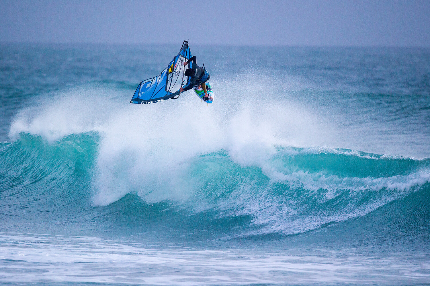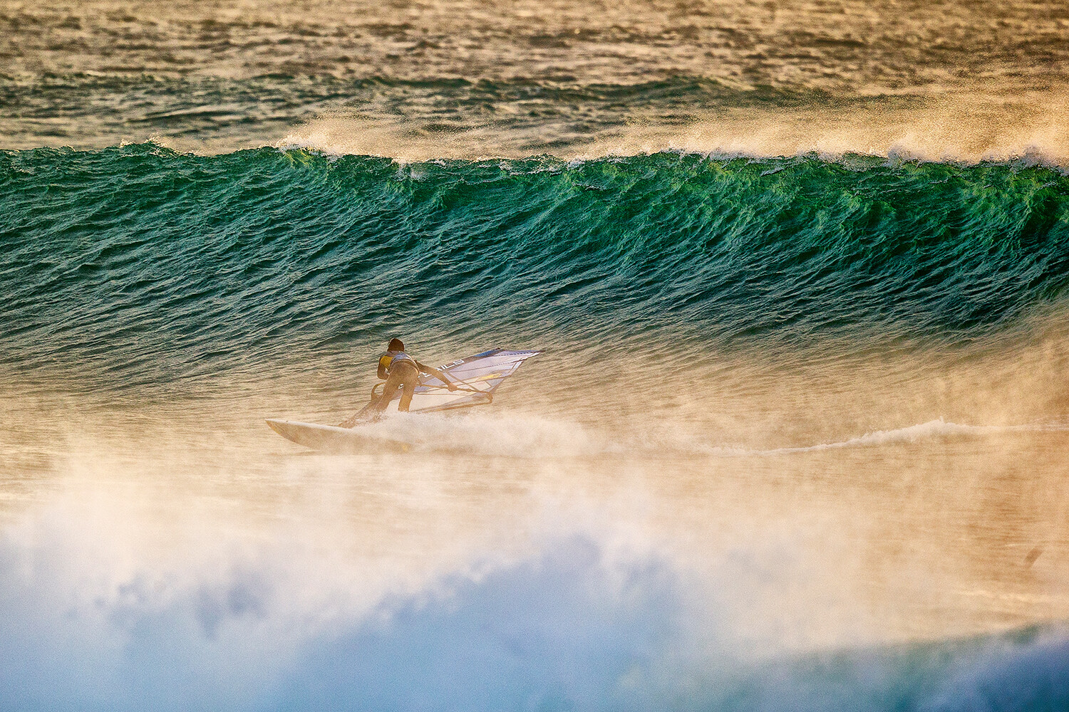 Finally we reached the far side of the sandbar, where Thomas was rigged and ready on the beach on the other side of the river mouth. All of a sudden, instead of a churned up mess we were looking at a groomed swell peeling down this invisible sandbar just beneath the surface, it was quite surreal. Mathieu had been dreaming of a windsurfing session like this for years and you could tell by his reaction after Thomas charged down his first perfect peeling wave that this was a joyous moment. Who better to christen a previously un-sailed wave than the legendary Thomas Traversa! The session unfolded into a mixture of amazing wavesailing alongside hair-raising moments in the boat. While the wave peeled perfectly down the bar, rogue wide swingers were breaking right where we were shooting and on more than one occasion the boat flew into the air while we were trying to capture Thomas charging huge aerials. After a solid two hours Thomas was exhausted and we decided to call it a day for this particular session. One last blast back through the chop was required which was actually far worse than the outbound journey but all credit to the boat driver for bringing us all back into the harbour in one piece.