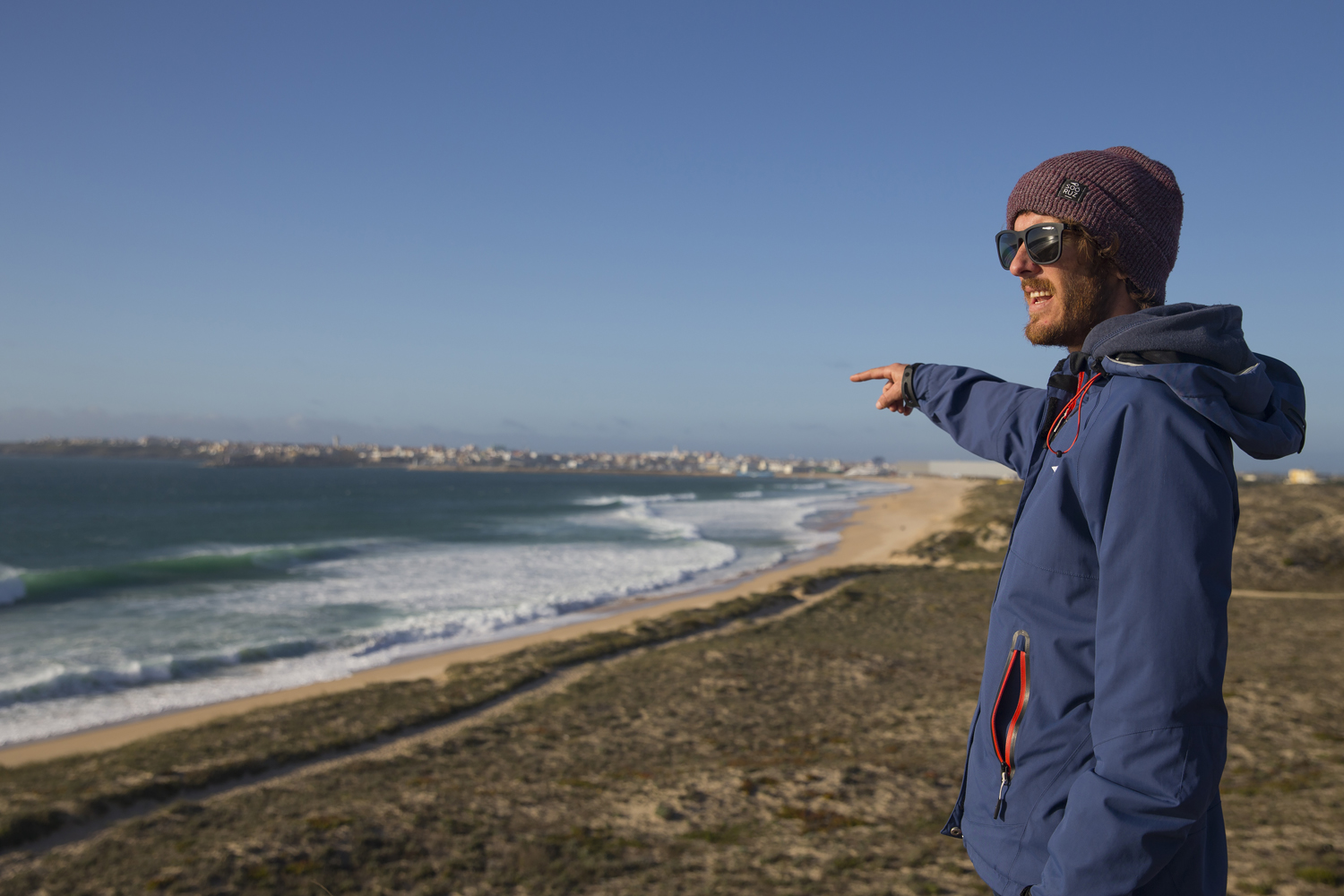 Thirty minutes down the highway we broke free of the clouds and drove out into beautiful clear sunshine. We arrived in Peniche around 3:30 p.m., and immediately drove up to a spot on the roadside and had to hike 500 metres through the dunes to check the conditions. Compared to the huge gnarly churned up mess at Nazaré, we were suddenly faced with amazing turquoise water, side-offshore winds and beautiful clean peeling waves. From the possibility of big wave utter carnage we had now switched to Plan B which was looking like down-the-line playful perfection. I’d love to have shot Nazaré naturally, but the compensation for missing out on that was not at all bad especially with Traversa as our designated sailor. If you had rocked up on any other trip to find these conditions you would be ecstatic and it was just what we all needed after the disappointment of missing out on Nazaré.