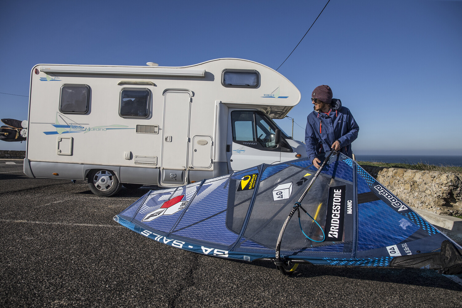 “The wave peels for two-three hundred metres with different sections, some of them really hollow. I heard about it about ten years ago and have wanted to sail it the past three to four years. This forecast was perfect and we were able to arrange the all-important boat to shoot from. The tides were huge so it only worked at its best for two hours. When we arrived it was beautiful. Clean glassy barrels peeling down the sandbar. It felt like we were in the middle of nowhere, but at the same time we were very close to the city of Lisbon. It felt extra special to have this sick wave all to myself, but right in front of a city with millions of people. I knew it would be good but there is that saying as long as you don’t try you will never know. I rode a lot of waves and we definitely scored, it looked like a wave you might only find in Indonesia!  Having a camper was always a dream. I came to Portugal with my family many times when I was young in one and now we have this we can go explore with our children. As a family, having a camper is so much easier and it is a warm place for the kids to hang out while I am sailing.