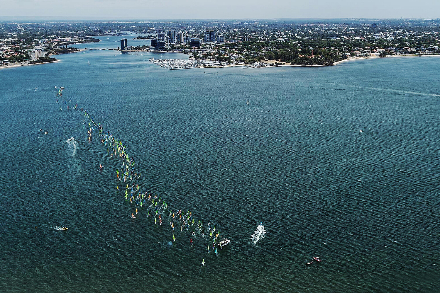We then dusted ourselves off and had the Marathon the next day, where it was forecast to be a proper belting sea breeze. And it eventuated. 250 people on a start line and what a start line it was. It was huge, with plenty of room to find some space as it ran along the freeway with the pin being right in under the South of Perth Yacht Club.
